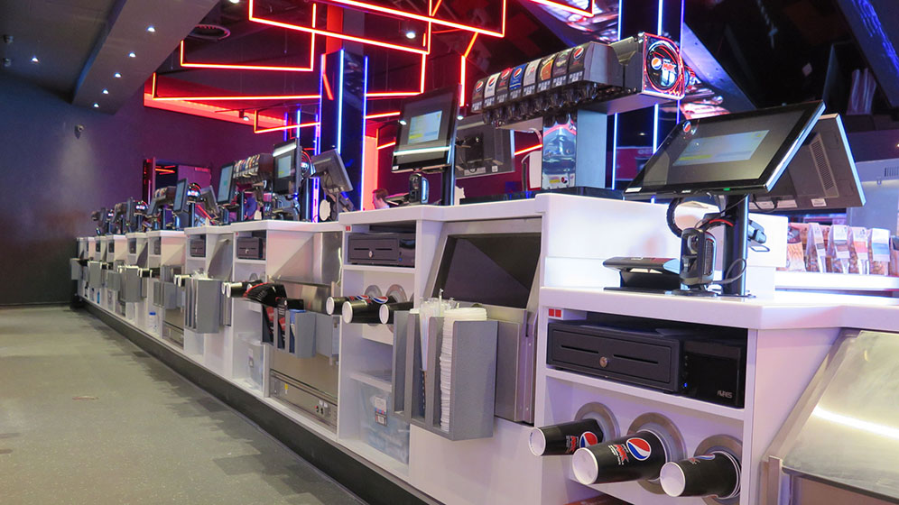 Working closely with Cineworld’s construction and operations teams, as well as architects such as NBDA, we design, manufacture and install all customer-facing areas. This includes expansive concession stands, box offices, ice cream cafés, pick-and-mix stores, VIP bars and premium lounge spaces. Our remit extends to the procurement and installation of all third-party equipment, ensuring seamless integration of every operational element.