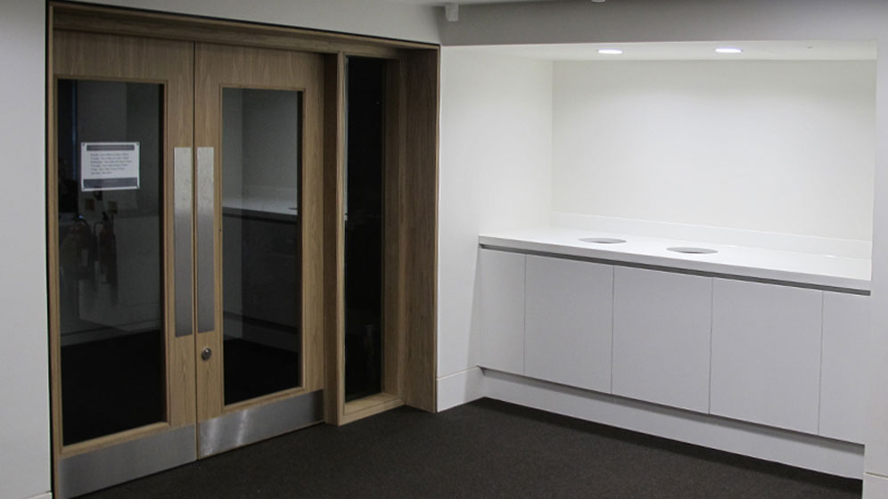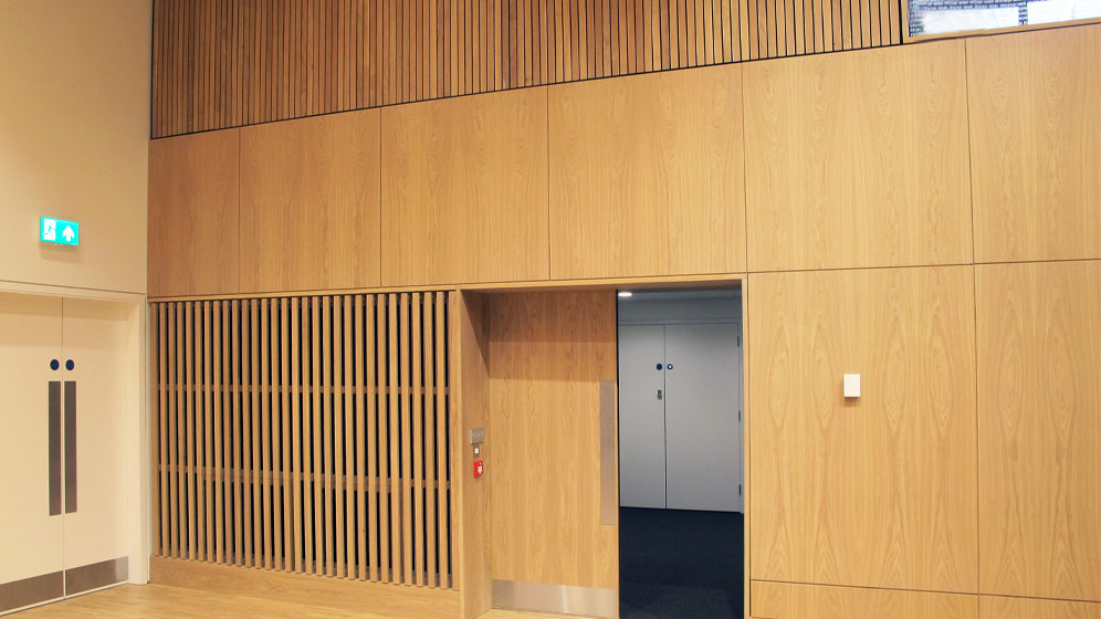Manufacture and installation of bespoke joinery including veneered wall panelling, café joinery, library furniture, door sets, poser tables and slatted screen elements.