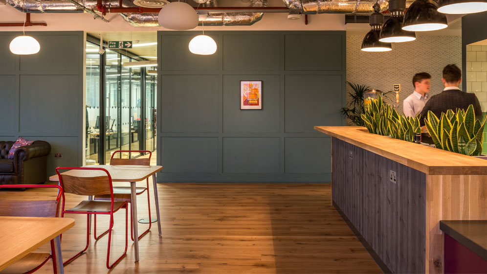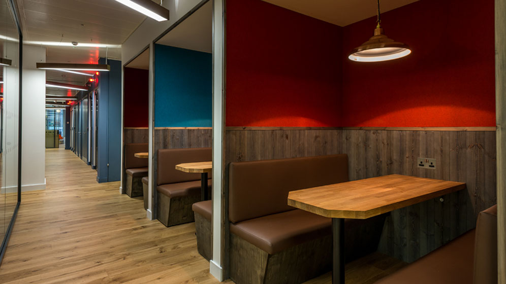 Bespoke joinery works including tea points, breakout areas, boardrooms, banquette seating, a reception desk and decorative wall panelling throughout the building.